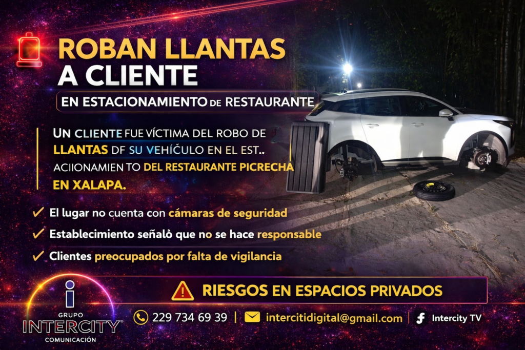 Xalapa, Ver.– Un comensal fue víctima del robo de llantas de su vehículo mientras se encontraba en el estacionamiento del restaurante Picrecha, generando preocupación entre clientes por la seguridad en este tipo de establecimientos.