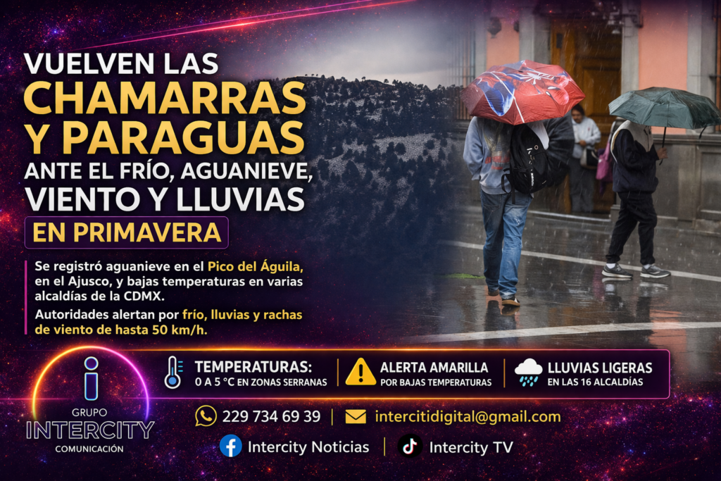 Ciudad de México.– En un fenómeno poco común para esta temporada, la capital del país enfrenta bajas temperaturas, lluvias, fuertes vientos e incluso caída de aguanieve, obligando a la población a retomar el uso de chamarras, suéteres e impermeables en plena primavera.